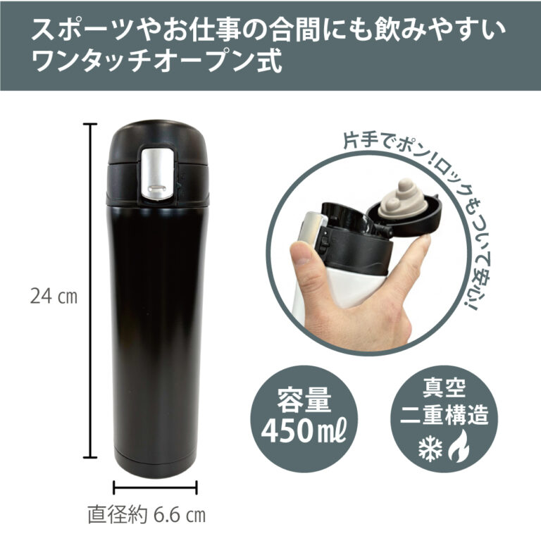 周年記念品として、また卒業記念品としても人気のワンプッシュ真空ステンレスボトル450ml。片手で開けられる便利な機能とドリンクホルダーに入るスリム設計が魅力。軽量化で持ち運びやすく、ドライブやオフィスでも活躍します。名入れサービス対応で企業ロゴや校章などもしっかり入れられます。