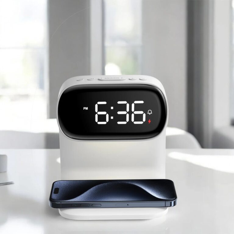 企業の周年記念品や特別なギフトに、実用性とデザイン性を兼ね備えた本当に喜ばれるアイテムを選びたいとお考えの担当者様に、ワイヤレスチャージングクロックをご提供します。スマートフォンを置くだけで充電が可能。忙しい朝や就寝前も、ケーブルを探す手間がありません。大きなLEDライト表示で時刻がすぐに確認でき、さらに便利な温度表示機能付き。枕元に最適な優しい光を提供する4段階調光ライトを搭載。夜間の目覚めや授乳時にも便利で機能性が高いデジタルクロックとして長くご愛用いただけます。ベッドサイドだけではなく、デスクやリビングにも馴染むシンプルでスタイリッシュなデザインです。背面に名入れ可能。企業のロゴやオリジナルメッセージををいれることができます。お客さまや従業員に感謝の気持ちを伝える、記憶に残る記念品を贈ってください。