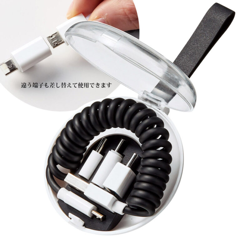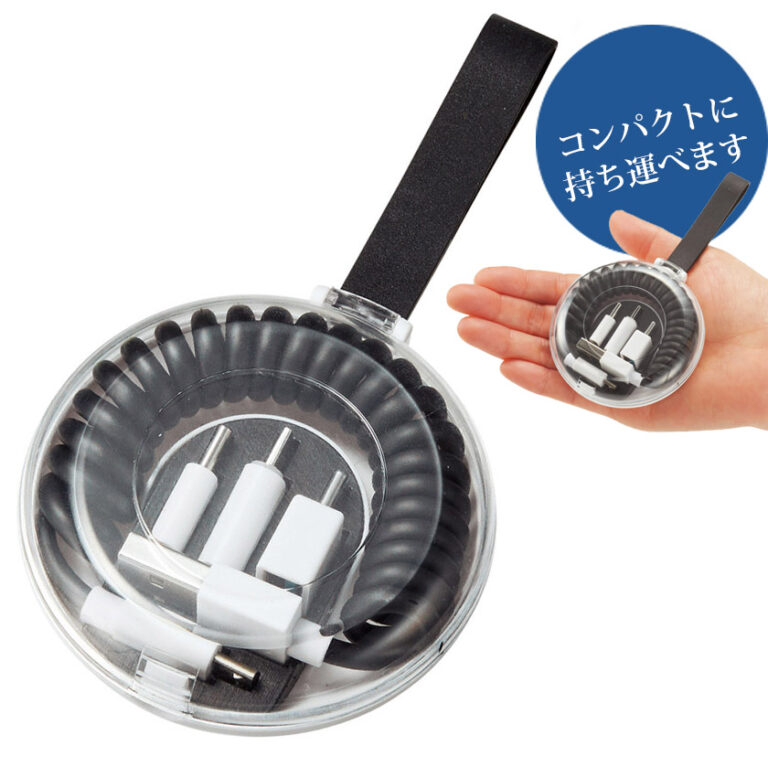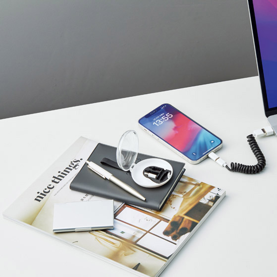 スマートなビジネスライフを支える機能性抜群のマルチコイルUSBケーブルを記念品にいかがでしょうか?いざという時に役に立つお助けギフトとして人気があります。専用ケースへの名入れが可能で実用性とブランド訴求を両立した今どきのガジェットノベルティです。マルチに使える変換アダプタは差し替えるだけで様々なスマートフォンやPC周辺機器の充電・通信が可能です。絡まりにくいコイルケーブルを採用。デスクの上もスッキリ見せることができます。持ち運びに便利な丸形の専用ケースが付属。シリコン製のストラップ付でバッグの持ち手などに吊り下げて携帯することも可能です。ケースの中央に企業のロゴや周年記念デザインを印刷できます。