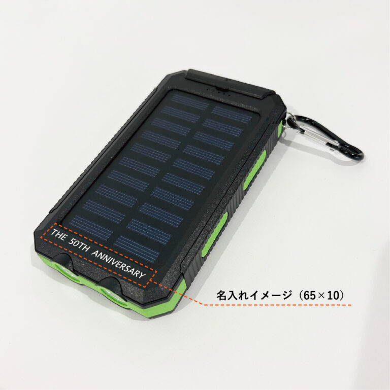 アウトドアやレジャーに最適なソーラーパネル付きモバイルバッテリーです。 ソーラーパネル搭載で日当たりに置いておけば自動で充電ができます。旅行やハイキングのおともにもおすすめ。 また、地震、災害時に非常用電源としても大活躍! (※日常で使う場合は太陽光の転換率を考えてUSBケーブルの充電で使用することをお勧めします。) 【高輝度LEDライト&SOS救急信号灯】高輝度LED照明が、地震、台風、災害、夜道、野外の暗い場所で活躍してくれます。緊急時にはLED懐中電灯をSOS信号灯としても利用できます。ーーーーーーーーーーーーーーーーーーーーーーーーーーーーーーーーーーーーーーーーーーーーーーーーーーーーーーーーーーーーーーーーーーーーーーーーー企業の周年記念品や学校の卒業記念品などに、日常使いでもいざという時でも活躍するソーラーバッテリーは、気の利いた記念品としてお喜びいただけます。一家に一台は備えておきたいアイテムです。落下や防水(日常防水)、防塵のタフなアウトドア仕様はデザインも格好よく若者にも人気があります。----------------------------------------------------------名入れメッセージが可能です。ご相談ください。 創業からお客様の想いや徴(しるし)をカタチにして40年、経験豊富なスタッフが大切な節目に寄り添います。「初めての注文で不安」「デザインの相談に乗ってほしい」という方もどうぞ安心してお任せください。