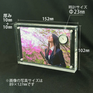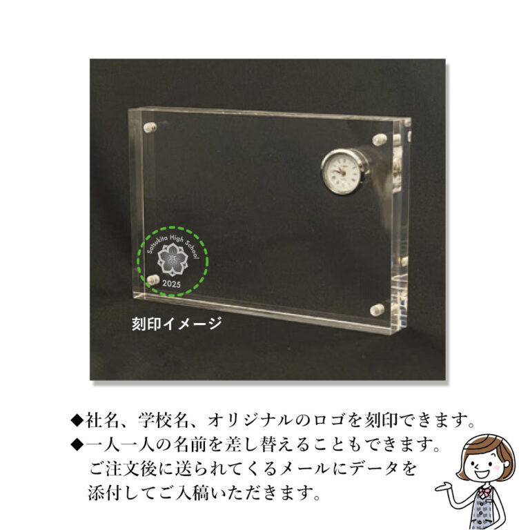 クリスタルのような透明感が美しい、時計付きのフォトスタンドです。周年記念の集合写真や、ご家族との大切な一枚を飾るのにふさわしい、上品なお品です。マグネット式で写真の入れ替えがスムーズ。簡単に写真を差し替えることができます。厚みのあるアクリルはデスクや棚に置くだけで、空間をパッと明るく華やかに彩ります。小型時計が埋め込まれており、フォトスタンドとしてだけでなく実用的な置時計としても活躍します。オフィスやリビングのインテリアにすっきりと馴染むでしょう。15個以上のご注文で、社名や日付のレーザー名入れが可能です。おひとりずつの名前を差し替えて刻むこともできる為、永年勤続や卒業記念など、パーソナルな贈り物としても高い価値を発揮します。【こんなシーンにおすすめ☞】●周年記念・式典ギフト…式典当日の集合写真を後日入れて飾っていただくための、心のこもった記念品として。●永年勤続・MVP表彰…表彰状の代わりに、活躍する姿を収めた写真と共に贈る特別なギフトに。●退職・卒業記念品…仲間との絆を形に残し、新しい生活の門出を祝う実用的なインテリアとして。